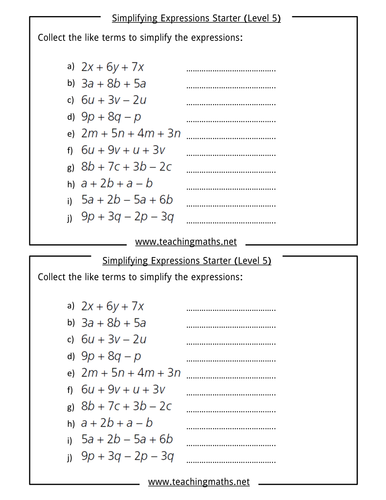 Menu Skip to content. Encourage more able students to generate a puzzle of their own that uses their understanding of expressions using the one at the end of the worksheet as a model Level 5 Links. For the record 3x² and 9x² are like terms because the exponents and variables are the same.